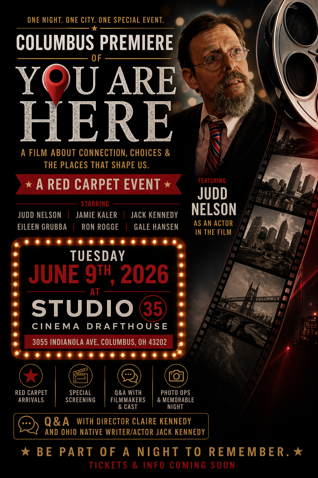 Join us for Hollywood in Columbus. Actor, Writer and Ohio native Jack Kennedy and Director Claire Kennedy are hosting a screening of their film You Are Here (with Judd Nelson). Arrive early for photo ops and a meet and greet with the filmmakers. After the screening, there will be a Q&A session with audience participation and merch giveaways.